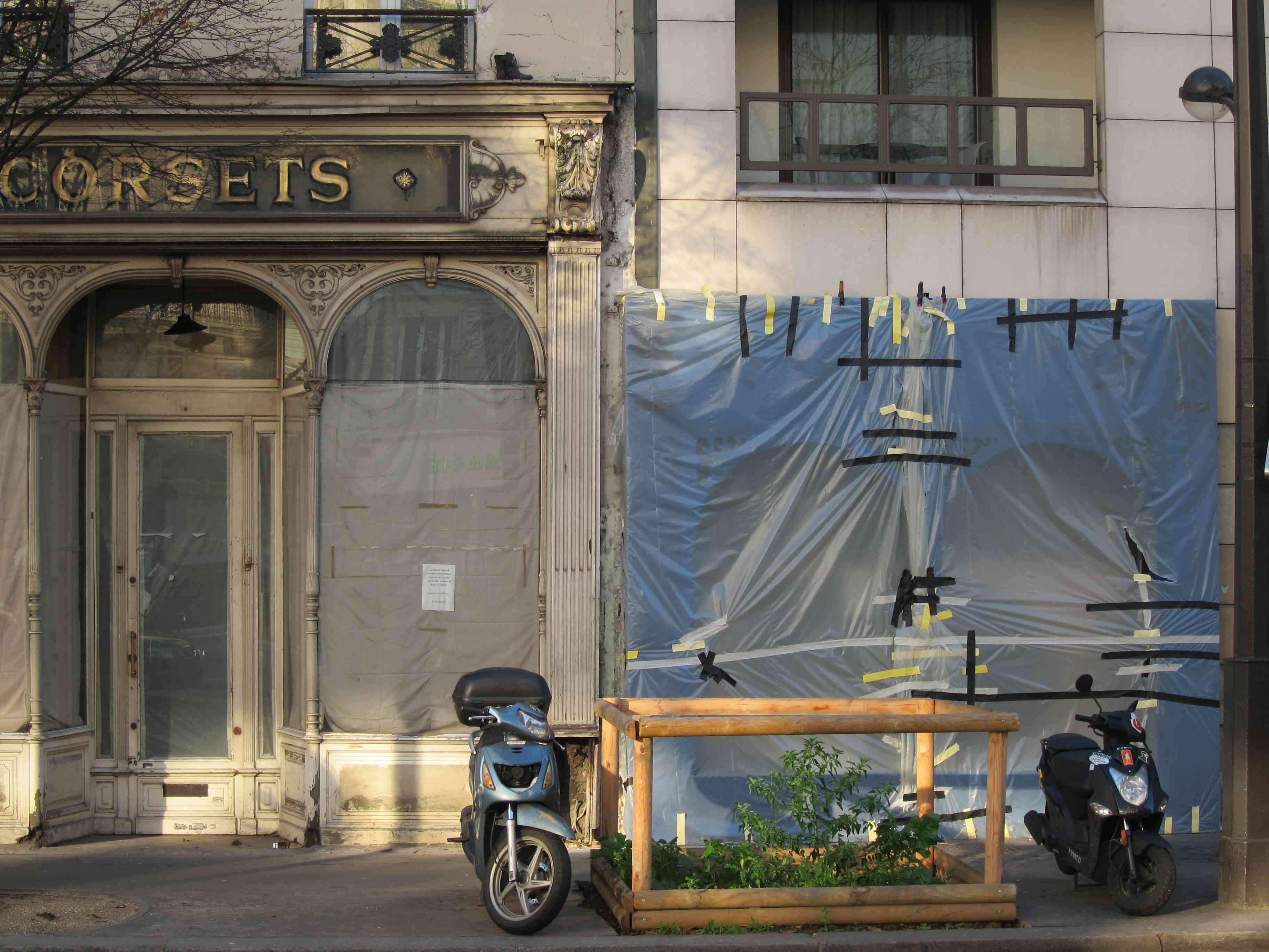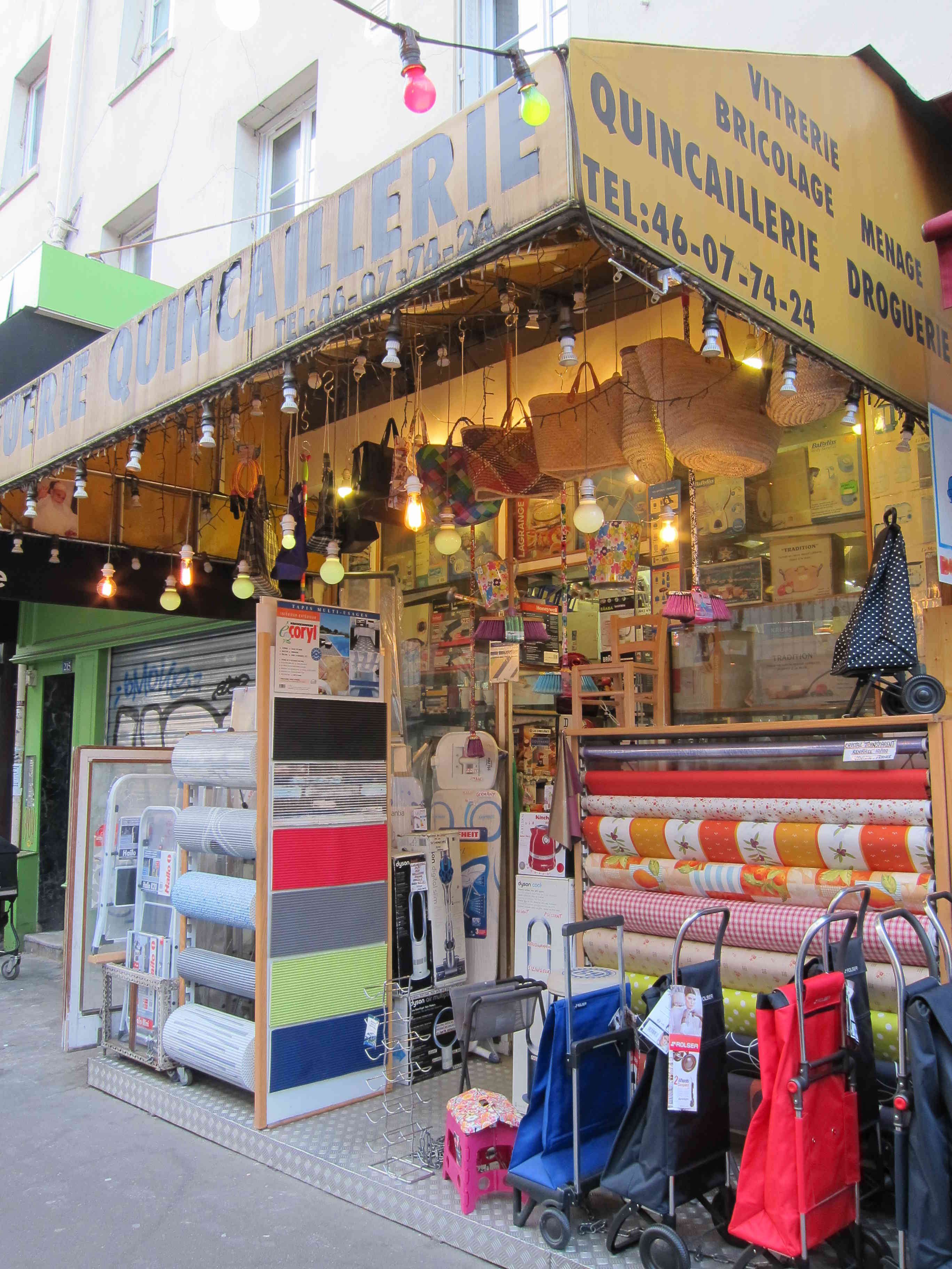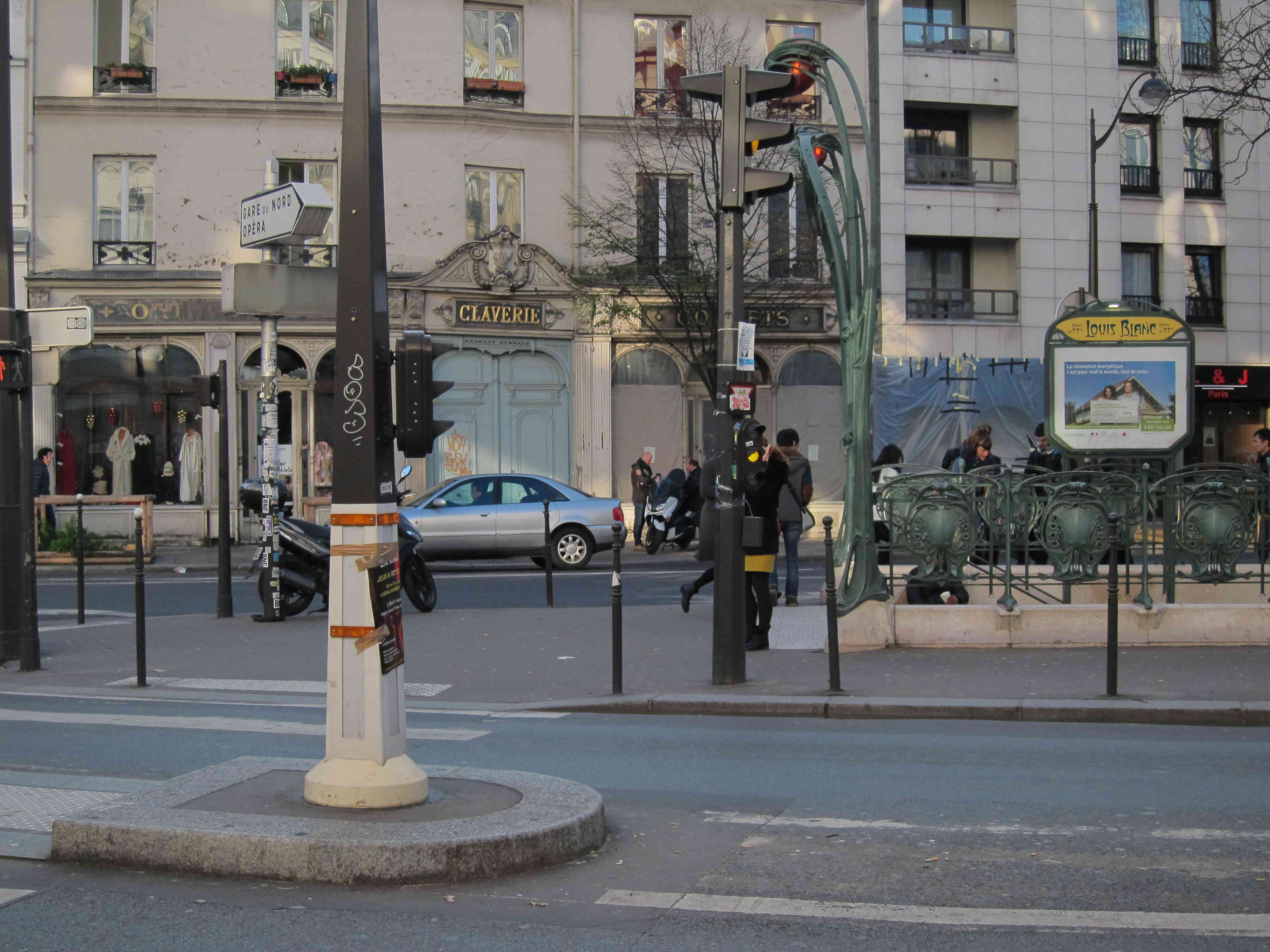 En face du métro Louis Blanc, j’aperçois une boutique qui semble n’avoir pas bougé depuis mon enfance : « Claverie, orthopédie, corsets ». Devanture d’un gris sale, ornée de moulures à l’ancienne, hautes vitrines en partie obstruées par des stores, laissant voir tout de même quelques modèles de robes dont on se demande depuis combien d’années elles s’affadissent ainsi sans un regard des passants. Je n’imagine même pas qu’on puisse entrer dans un tel magasin, je n’y ai jamais mis les pieds, c’est certain. Mais il représente bien un type de commerce installé dans la durée du siècle, à l’opposé des enseignes qui se succèdent aujourd’hui d’une année sur l’autre, voire moins. Je me rappelle, dans le même registre, un vieux magasin de ficelles et cordages, rue Lafayette, dont j’ai toujours vu les immenses vitrines vides de toute animation, au point que j’avais l’impression d’un temps arrêté, déposé comme la poussière sur ces rouleaux de câbles indestructibles. Il y avait le faubourg vivant et ce faubourg mort, figé du moins, celui des négoces spécialisés, destinés à une clientèle furtive d’habitués, fonctionnant ou vivotant sans publicité dans la pénombre des blouses grises et des hauts rayonnages en bois de chêne. Aujourd’hui, on y vend du mobilier et des fournitures de bureau.