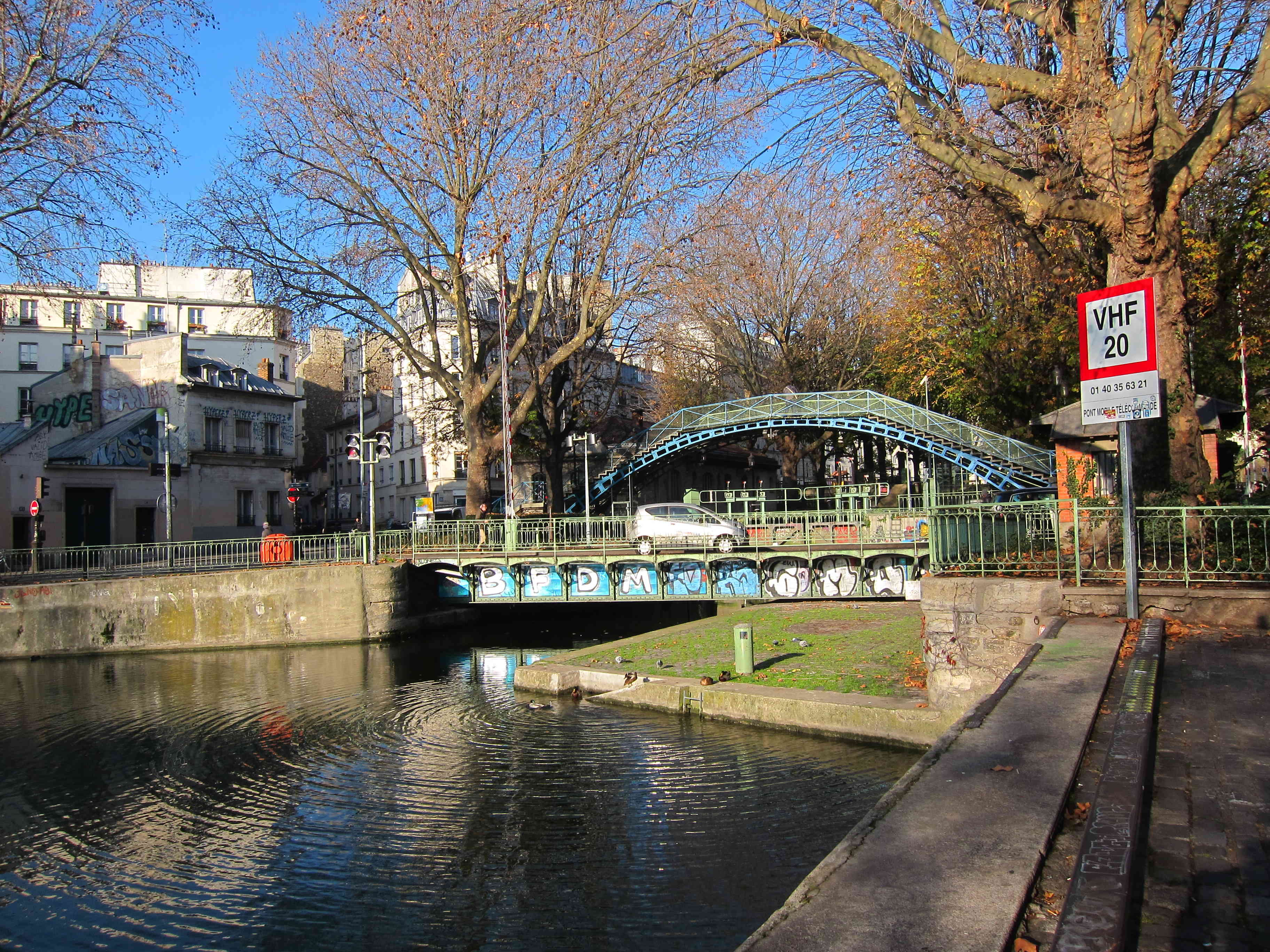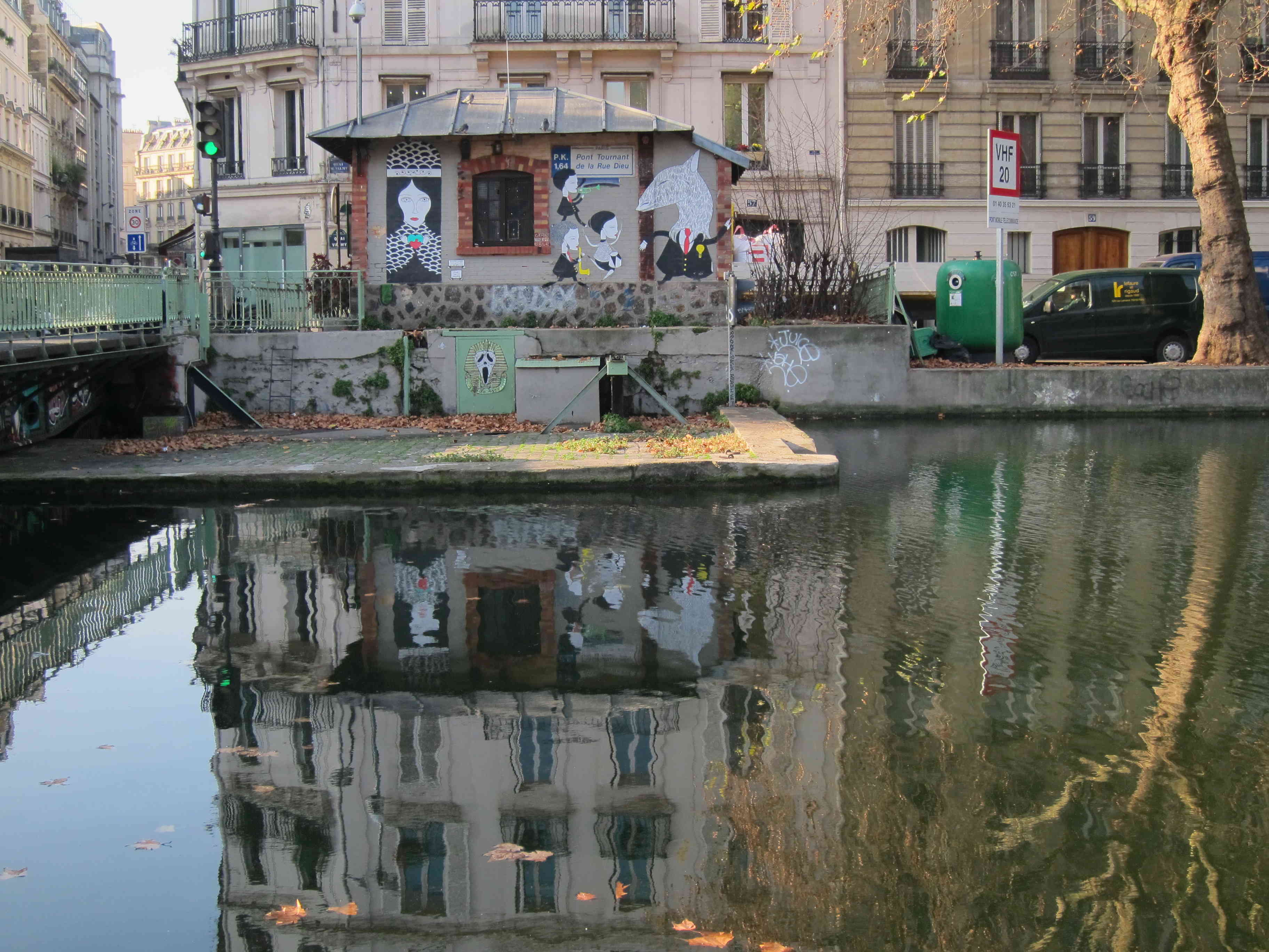Une fois passé l’écluse, on retrouve la ville et ses insistances : des tags sur les soubassements du pont et une librairie d’art d’un rouge vif qui proclame que les nouveaux occupants sont bien installés. Ils laissent leurs traces un peu partout, graffitis, collages et, le premier aperçu ce matin-là, un immense bandeau noir « Fluctuat nec mergitur » qui proteste en silence contre les attentats.