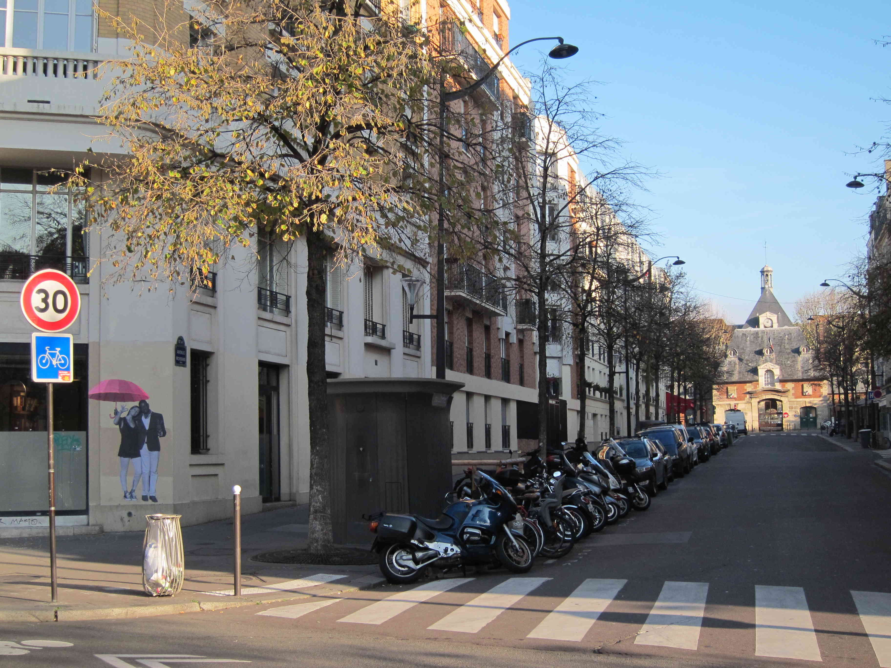 L’avenue Richerand m’offre soudain une vue sur l’hôpital Saint-Louis auquel m’attachent les souvenirs douloureux, puis réconfortants d’une opération et d’une hospitalisation de plusieurs semaines. Je prends la photo en incluant dans le cadre ce collage réjouissant d’une femme blanche et d’un homme noir souriant sous un parapluie rose, sans réaliser que, un peu plus loin sur la droite se trouve le restaurant Le Cambodge qui appartient aux mêmes propriétaires que ceux du Petit Cambodge, mitraillé le 13 novembre par les terroristes. Je ne vois tellement pas ce quartier comme un lieu de sorties nocturnes que je ne repère pas les lieux-phares de ces derniers jours.