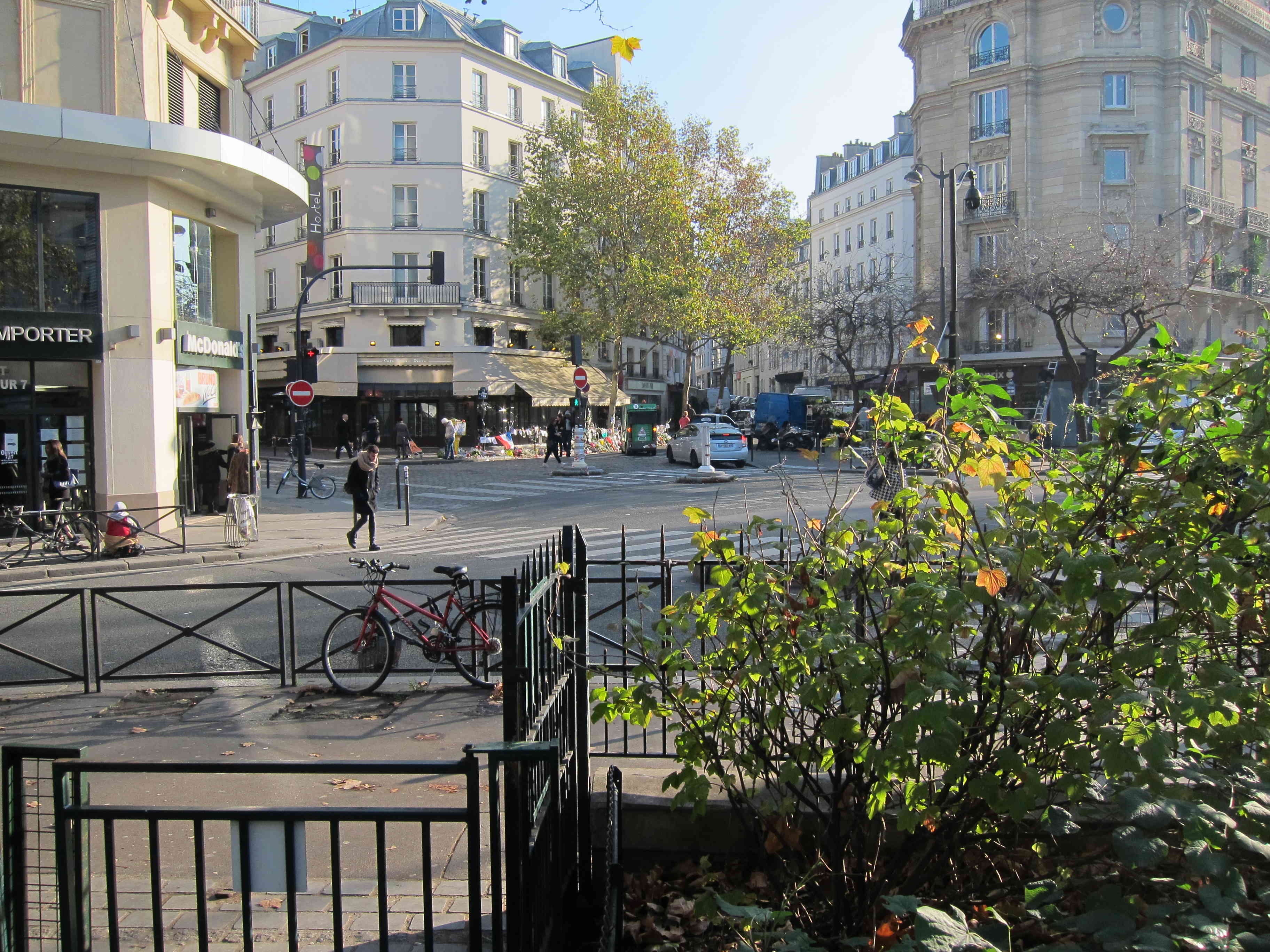 Impossible pourtant de les manquer lorsque je parviens à la rue du faubourg du Temple : le regard est immédiatement attiré par le parterre de fleurs qui jonche le trottoir devant le restaurant Le Carillon. Des passant s’y arrêtent, certaines voitures ralentissent. Une semaine seulement a passé depuis les attentats.
