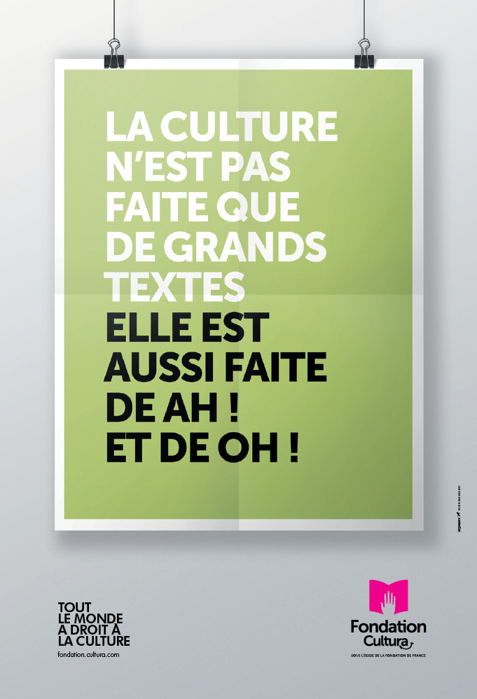 La Fondation Cultura est le versant bienfaisance de la chaîne de grande distribution du même nom. Son ambition est de « développer la culture et la rendre accessible au plus grand nombre, y compris aux populations qui en sont éloignées« . Très bien. Tous les ans, elle lance une campagne d’affichage pour affirmer l’importance de la culture et de son accès à tous, sans toutefois préciser ce qu’elle entend par culture.