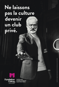 Je ne sais pas si vous avez vu cette campagne publicitaire de la Fondation Cultura, mais pour ma part elle m’a profondément choqué. Comment en effet peut-on faire passer Victor Hugo pour le vigile d’un club privé chargé d’éconduire le commun des mortels qui n’en font pas partie ?