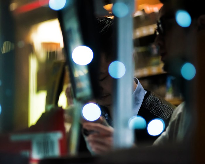 Les deux motifs récurrents de l’indifférence nocturne traquée par Eric Alcyon sont l’emprise du téléphone portable et le reproche vivant des miséreux.