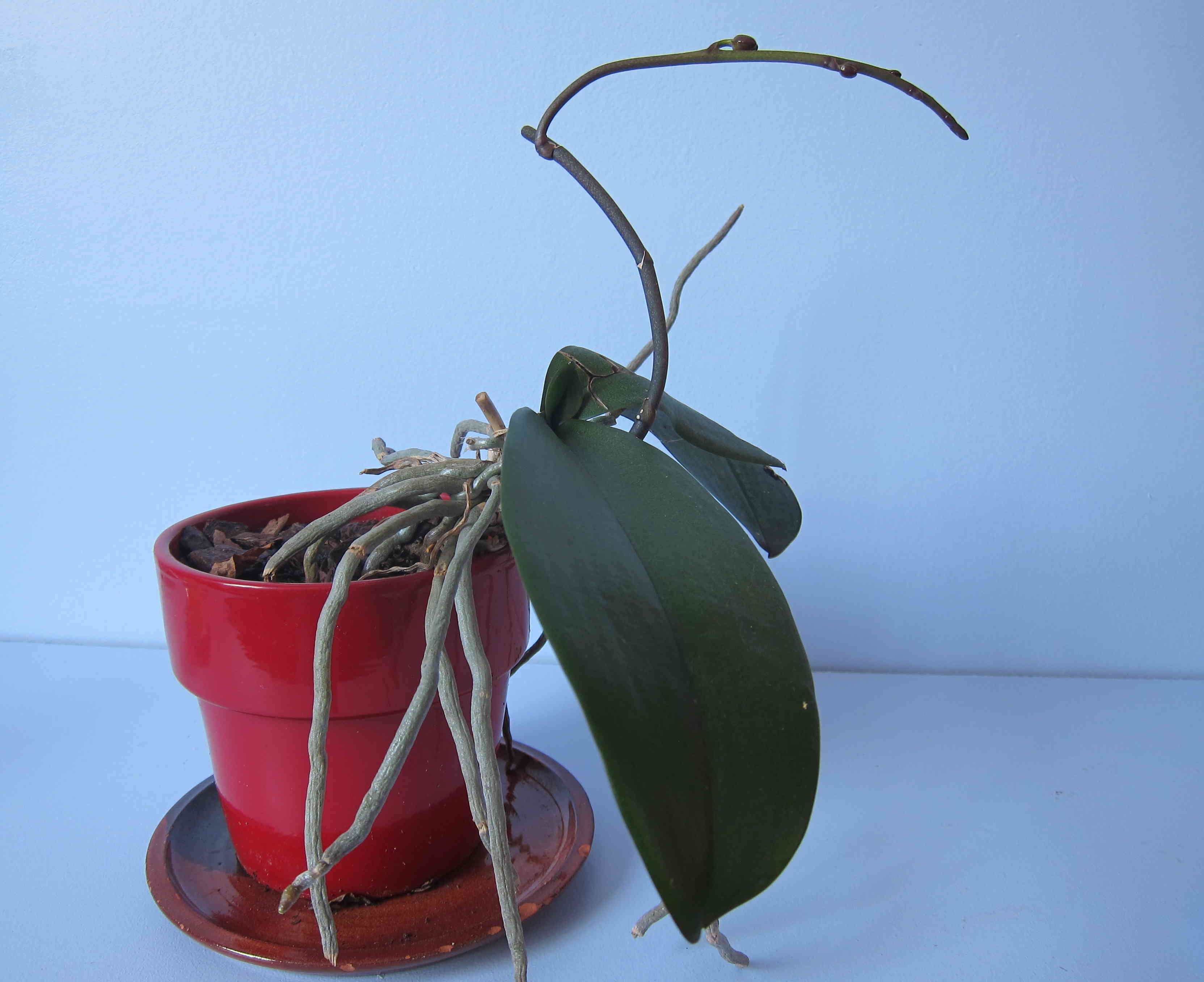 Alors qu’elle arborait fièrement ses premiers boutons, sa hampe florale a été cassée net. Aussi muette que l’injustice, l’orchidée s’est figée dans une immobilité végétative qui n’augurait plus aucun essor. Elle se mura dans l’existant pendant plusieurs semaines. L’énigme d’une plante en proie aux forces souterraines, qu’en saurons-nous jamais ?