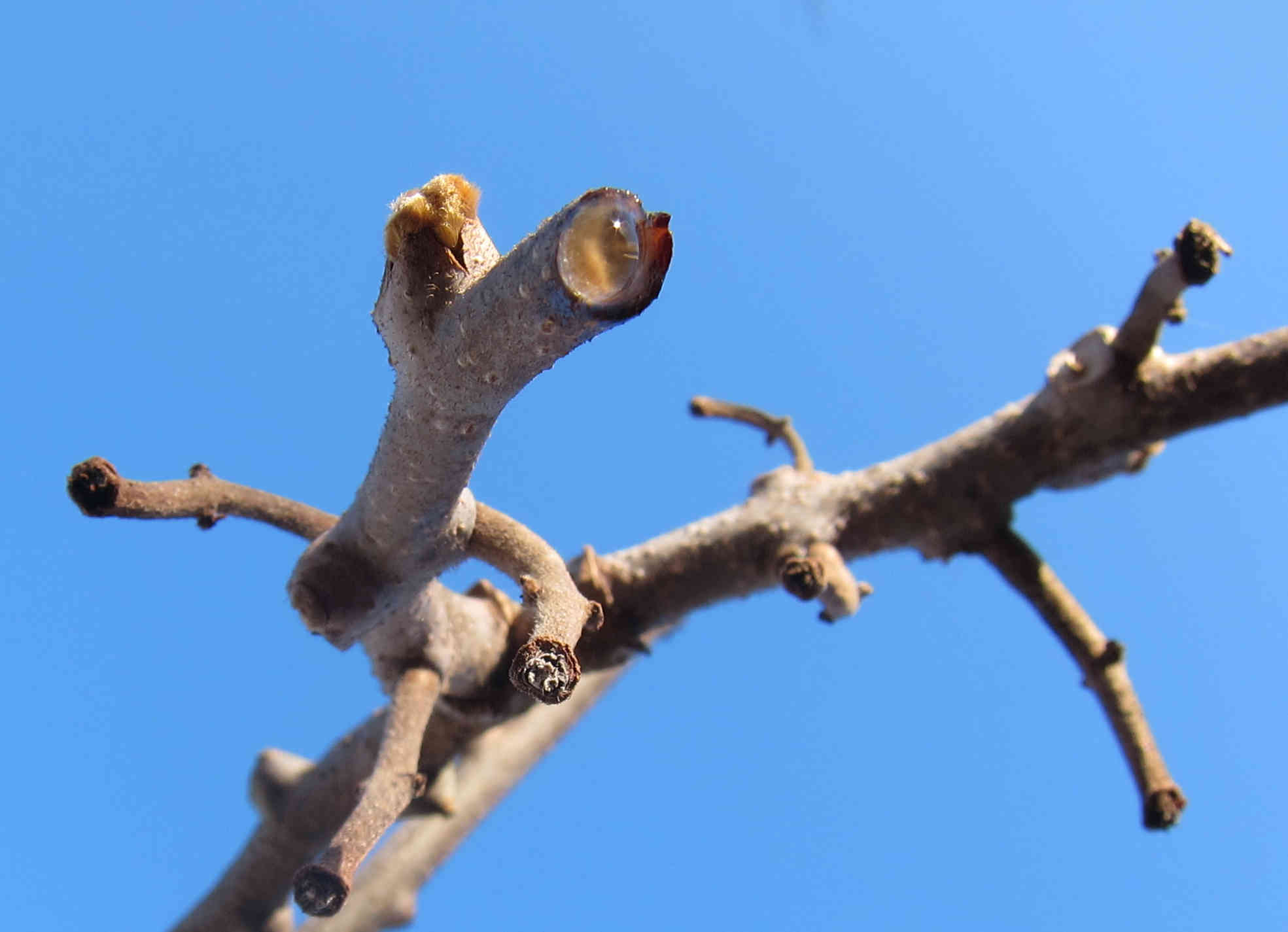 La sève coule de la branche coupée.