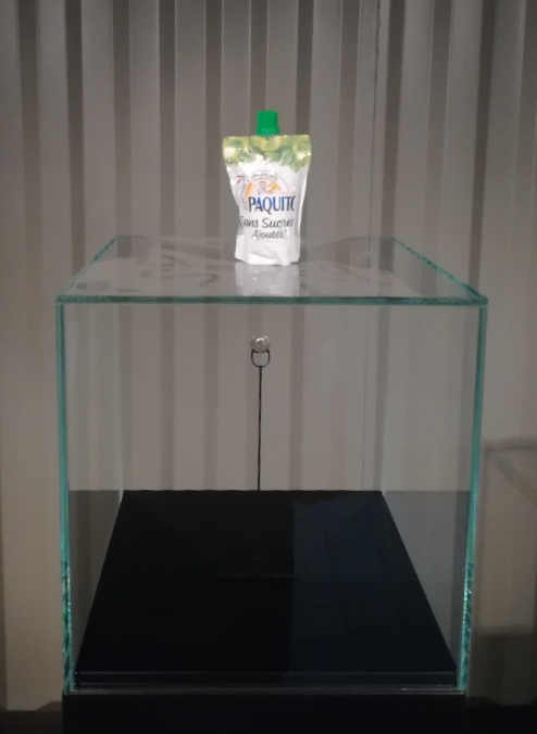 Plus tard, repassant devant le même box, je découvre que l’installation a changé, ou plutôt qu’elle a été modifiée : une gourde vide de compote a été déposée sur la vitrine, juste au-dessus de la pièce.